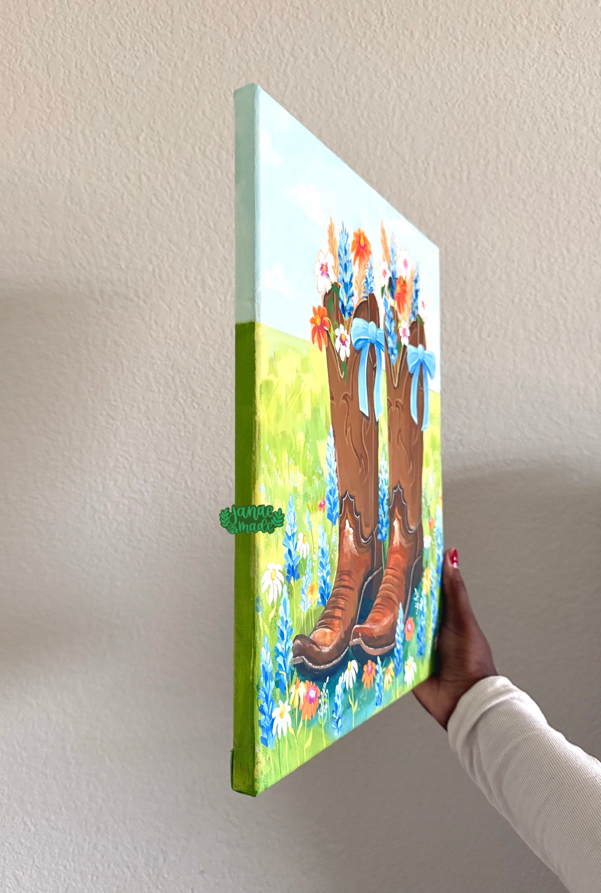 Spruce up your office or living space with this one of a kind canvas set in the Texas Hill country. From the detailed boots to beloved Bluebonnets, this western canvas is perfect for the experienced and aspiring cowgirl alike!