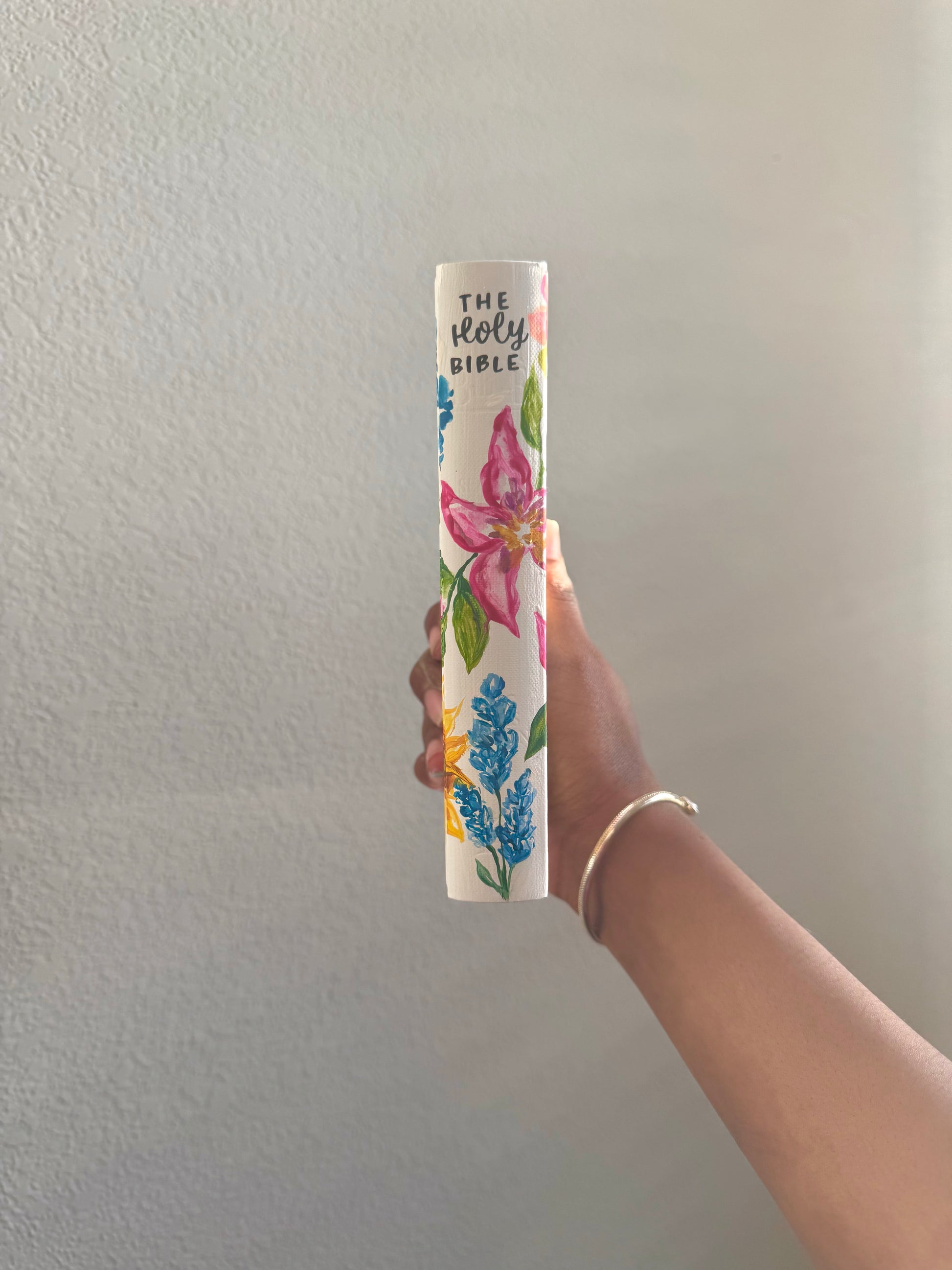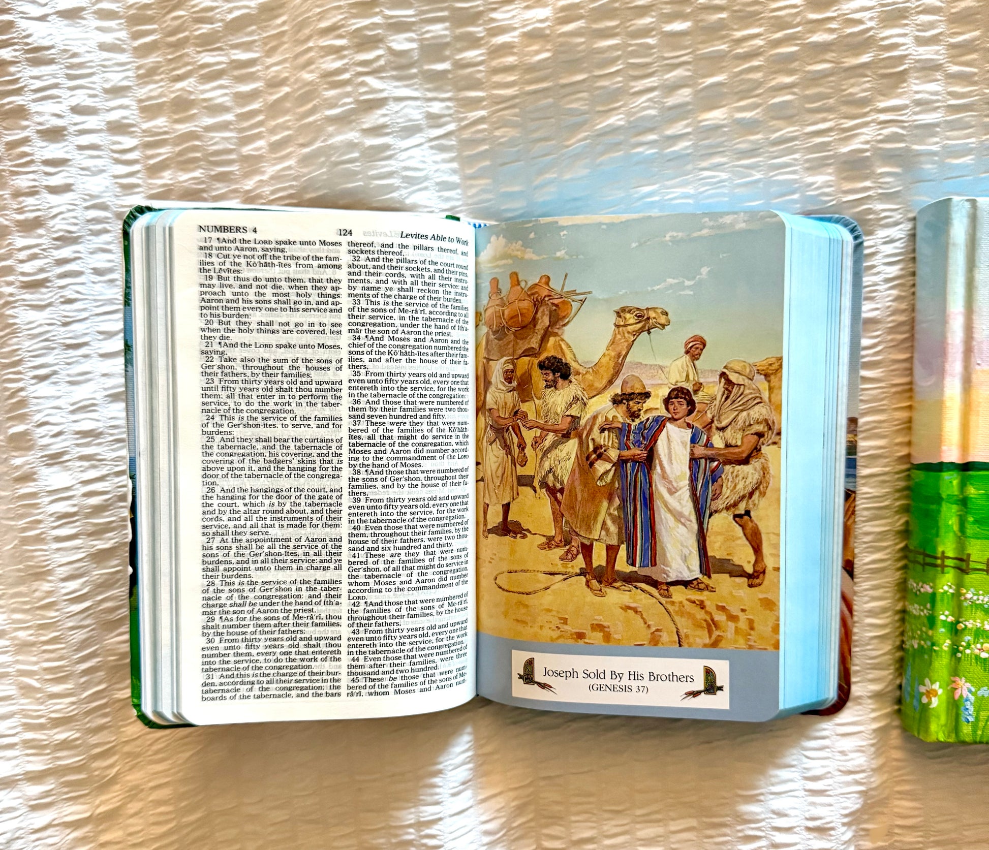 This beautiful hand painted Bible is a must have for your little reader (ages 3-7)! This One of a kind Bible features so much more than a captivating watercolor style design on the cover. With detailed illustration within encompassed by a compact 5x7 size, this Bible is a makes for a great and timeless keepsake for a little one in your life!